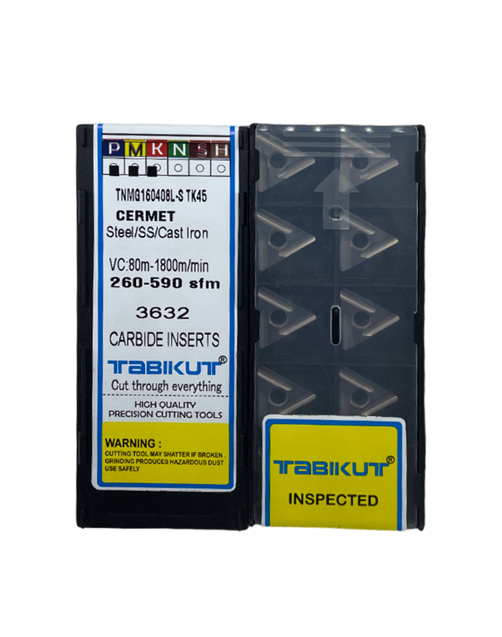 TABIKUT TK45 Cermet grade for turning alloy steels & stainless steels with high surface quality and long durable tool life due to high edge wear resistance and low coefficient of friction with economic price.