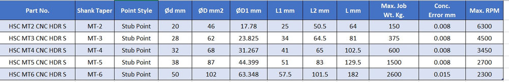 Turnmax High Speed CNC Revolving Centers (Stub Point Type) are specially designed live centers for high-speed CNC turning operations where short projection and maximum rigidity are required. The stub point design provides enhanced stability, reduced deflection, and improved machining accuracy, especially for heavy-duty and high RPM applications.