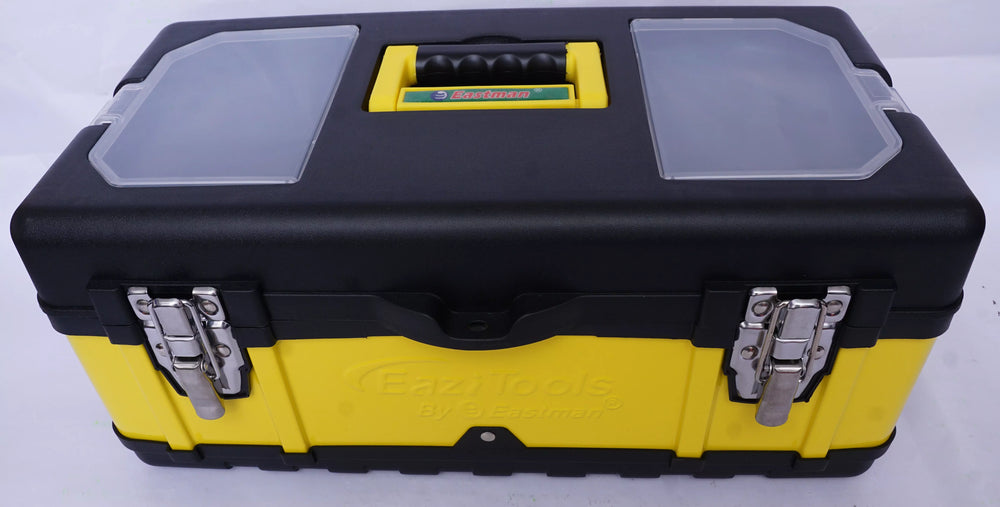 • Inside there is typically a plastic tray/organizer tray (as with Eastman’s plastic-and-steel tool box line) — useful for sorting small tools, screws, nails, bits, etc.