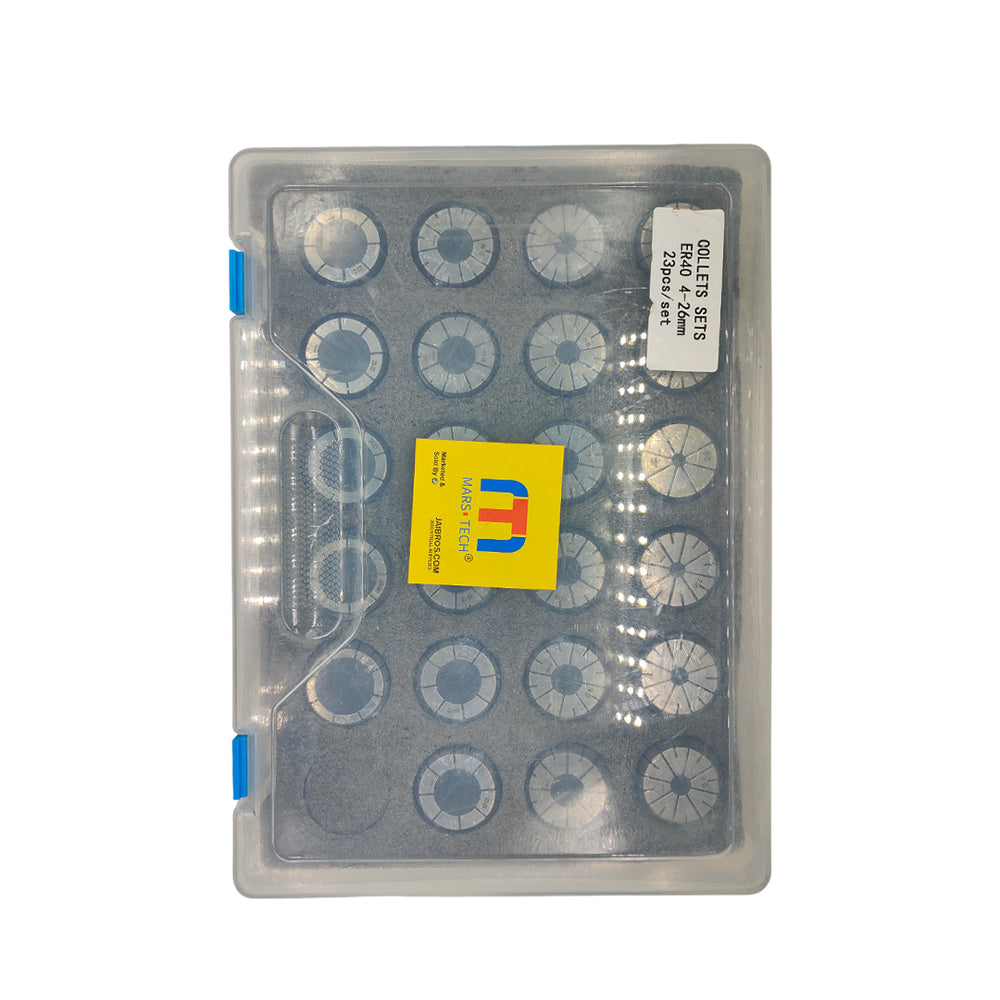 ER40 series collets have a capacity of 3mm-26mm. Each ER40 collet has a range of (1 mm). The size indicated on the collet is the largest size it can hold and can be collapsed smaller within its collapse range of (0.9mm). For example, ER40-6mm can grab a round shank from 6mm diameter to 5.1mm diameter.